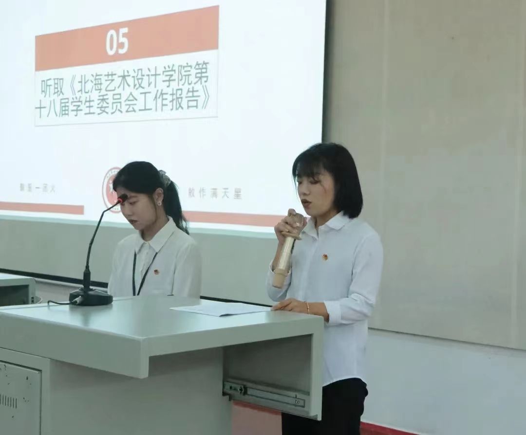 正式会议第五项,由学生会主席团成员代淳淳同学宣读《北海艺术设计学院第十八届学生委员会工作报告》;