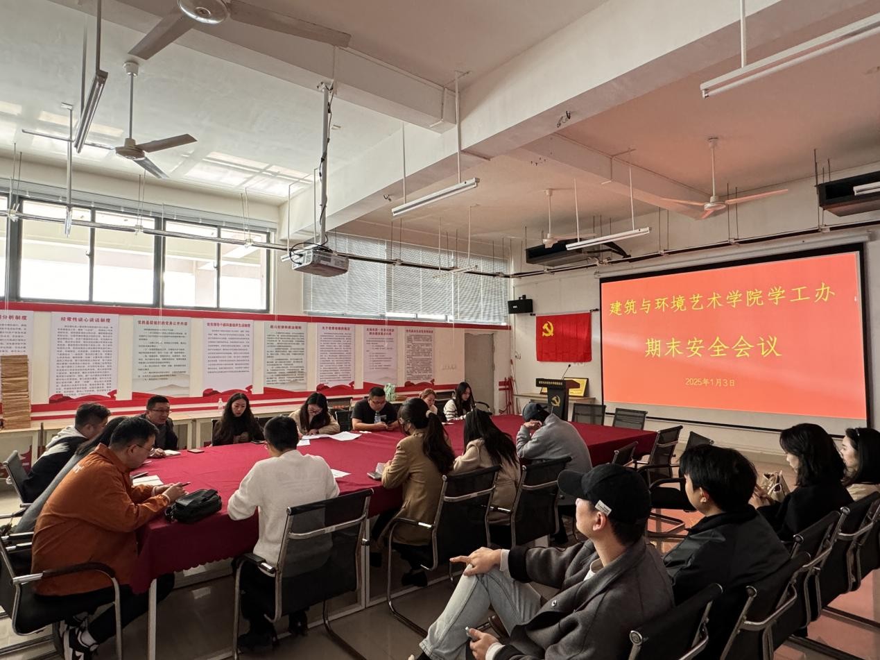 2025年1月3日,建筑与环境艺术学院学工办期末安全会议在公德楼507召开。本次会议由建筑与环境艺术学院党总支副书记曲玥与学工办主任郭溪共同主持,参与会议的人员包括学工办全体成员以及22至24级的年级和班级辅导员。会上着重强调以下要点: