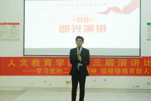 经过主题演讲环节的精彩角逐,前6名选手进入第二环节:即兴演讲。即兴演讲限时三分钟,选手抽签决定比赛顺序,再依次按顺序抽题并进行即兴演讲。此环节对选手知识积累、语言组织能力、心理素质、临场反应能力等方面都有所考察。