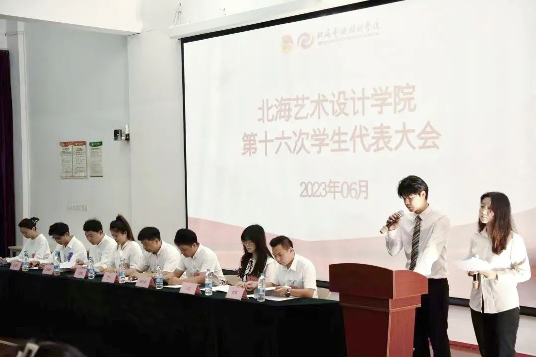 经过民主选举,产生了北海艺术设计学院第十六次学生会主席团成员,并宣读了倡议书。