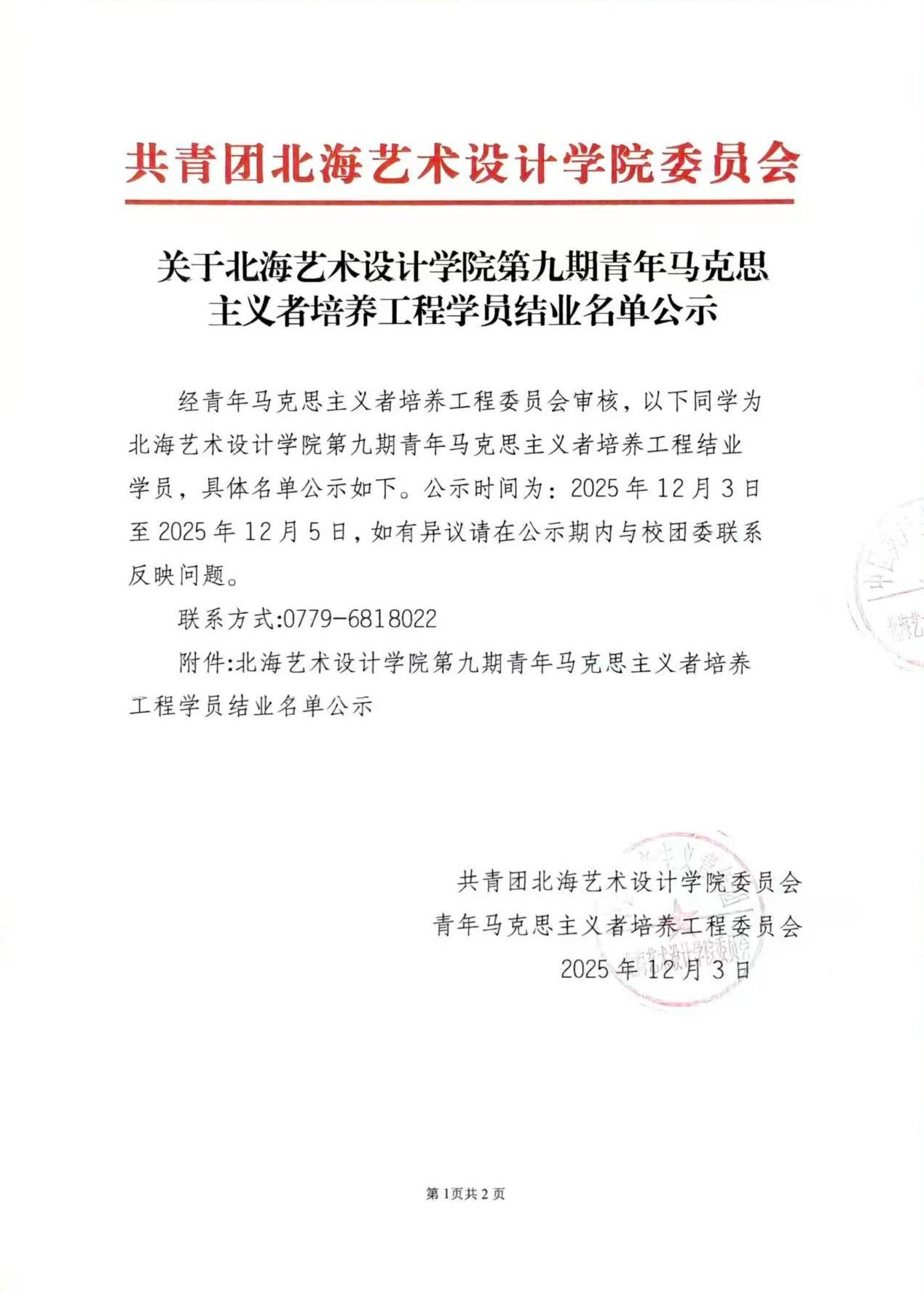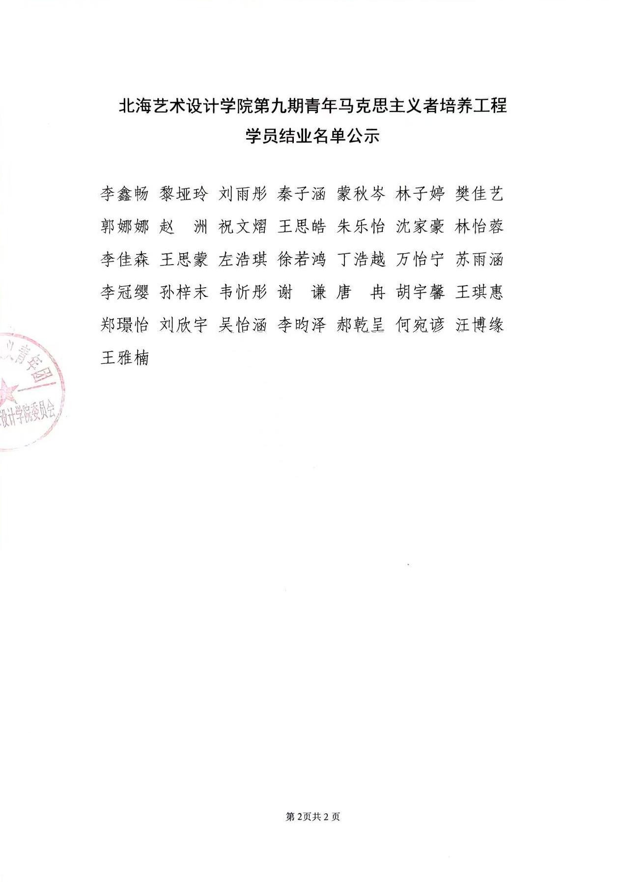 北海艺术设计学院第九期青年马克思主义者培养工程学员结业名单公示