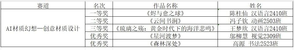 每一份参赛作品,都是学子们艺术素养与AI技术应用能力的集中体现;每一票的认可,都承载着对创新精神的推崇与鼓励。大赛秉承公平、公正的原则,现将最终评选出的各类奖项名单公示如下