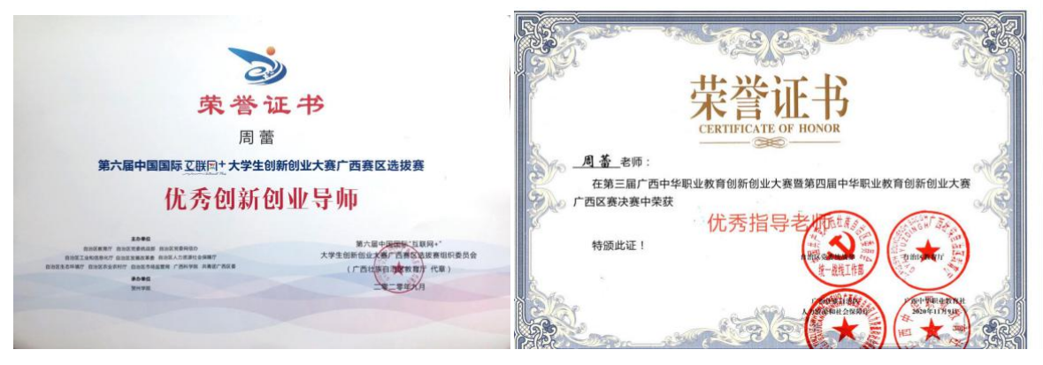 周蕾老师不仅有丰富的教学实践和研究经历,还擅于辅导和帮助学生参加各级各类赛事。仅近几年组织、指导学生参加的赛事就有15项,如:2020年8月,指导学生姚远参加第六届中国国际“互联网+”大学生创新创业大赛项目,荣获国家级铜奖;2020年10月,指导学生张志桓参加“第三届广西中华职业教育创新创业大赛暨第四届中华职业教育创新创业大赛,荣获广西区金奖;2019年,指导学生唐庆参加“全区高校第三届大学生创客马拉松”荣获自治区一等奖;2021年,辅导学生马丰杰创作的作品《石雕归墟》荣获广西壮族自治区委员会统一战线工作部主办第三届中华职业教育社非遗创新大赛广西赛区本科组第三名,并获国赛推荐资格。其次,辅导各级各类自治区级赛事银奖2项、铜奖13项。由于周蕾老师的辛苦付出、培育,让她收获了多项个人奖项和荣誉,如2021年,参加广西壮族自治区委员会统一战线工作部主办第三届中华职业教育社非遗创新大赛获广西区赛非遗教学成果团队二等奖;荣获自治区“优秀创新创业导师”和“优秀指导老师”、北海艺术设计学院“师德先进个人”、北海市青年创业创新“优秀导师”等荣誉称号。
