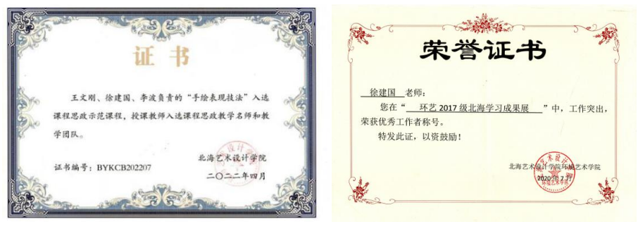 实践育人,教学相长,亲自带领,鼓励学生积极参与校企合作教学,帮助学生提高实践能力和学习效果。从教以来,徐建国老师多次指导学生参加大学生创新创业训练项目和实践学习,收获荣誉多项。如:2021年,指导学生陈金完成自治区级2018年大学生创新创业训练项目《绿色植物背景墙设计制作创意工作室》,项目编号201813524029;指导学生向奇完成2019年国家级大学生创新创业训练项目《奇点智能化设计工作室》,项目编号201913524005。2017年,指导学生吴清清参加第五届NCDA大赛,荣获全国总决赛二等奖;2021年,指导学生陈孔雯参加第九届全国高校数字艺术设计大赛,荣获全国总决赛三等奖;2022年,指导学生张芷琪参加全国大中学生第11届海洋文化创意设计大赛,荣获佳作奖;同年,指导学生姚永康、关书晓参加学院杯中国室内与环境设计大赛,荣获室内组优秀奖。