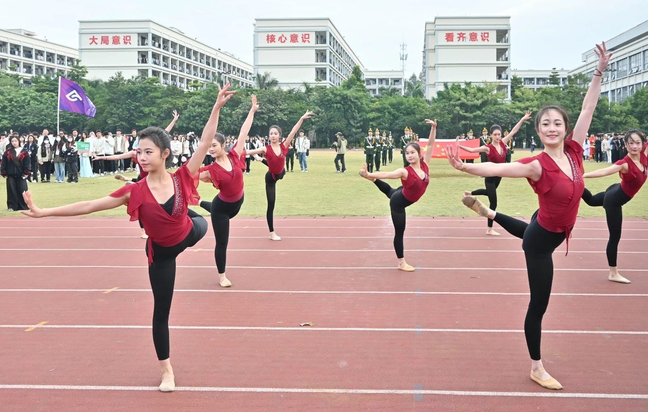 伴着昂扬的运动员进行曲,人文教育学院代表方队步伐整齐地走向主席台,并在主席台前呈现精彩表演。他们挥舞手臂,昂首阔步,气宇轩昂,意气风发,展现出蓬勃的青春女生婀娜多姿,男生铿锵有力,配合默契,一曲舞毕,全场掌声雷动。