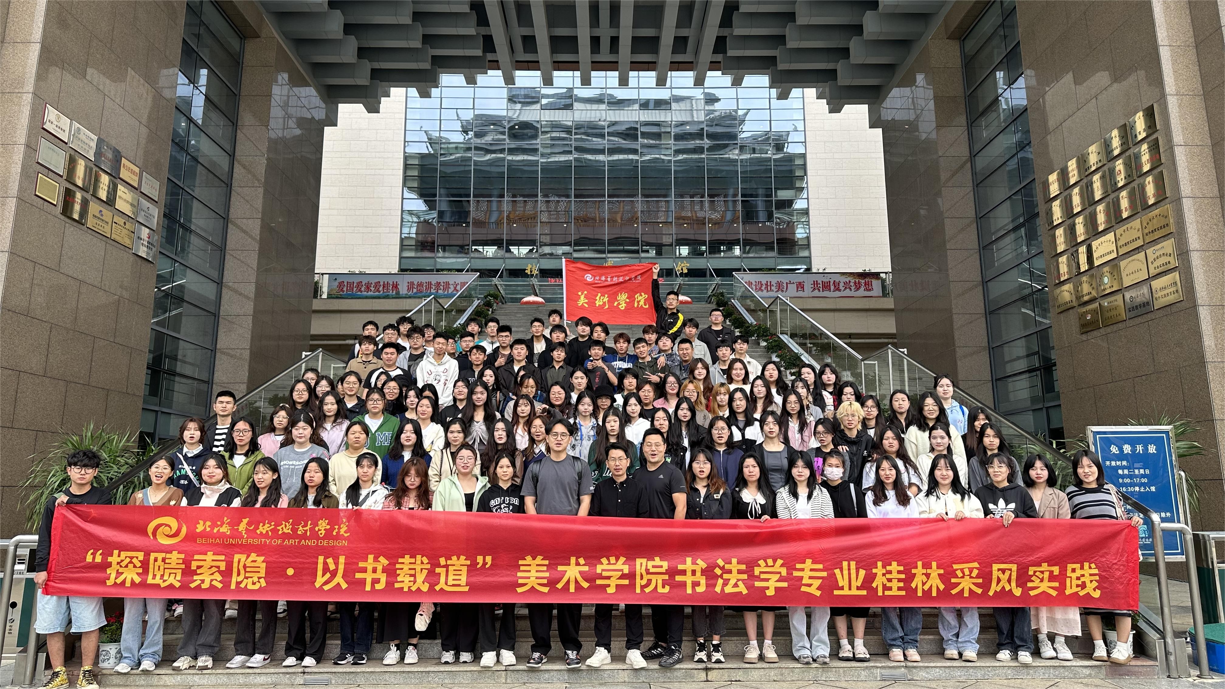 美术学院书法学专业2022级百余名学生于2023年11月6日,由书法学教研室主任苏乃从及多位专业教师组织带领前往桂林开展“探赜索隐·以书载道”专业采风实践教学活动,重点考察桂林的历史文化、石刻艺术、考古遗迹、风土人情、红色文化、山水风光等,旨在开拓学生的视野,积累艺术创作内涵。