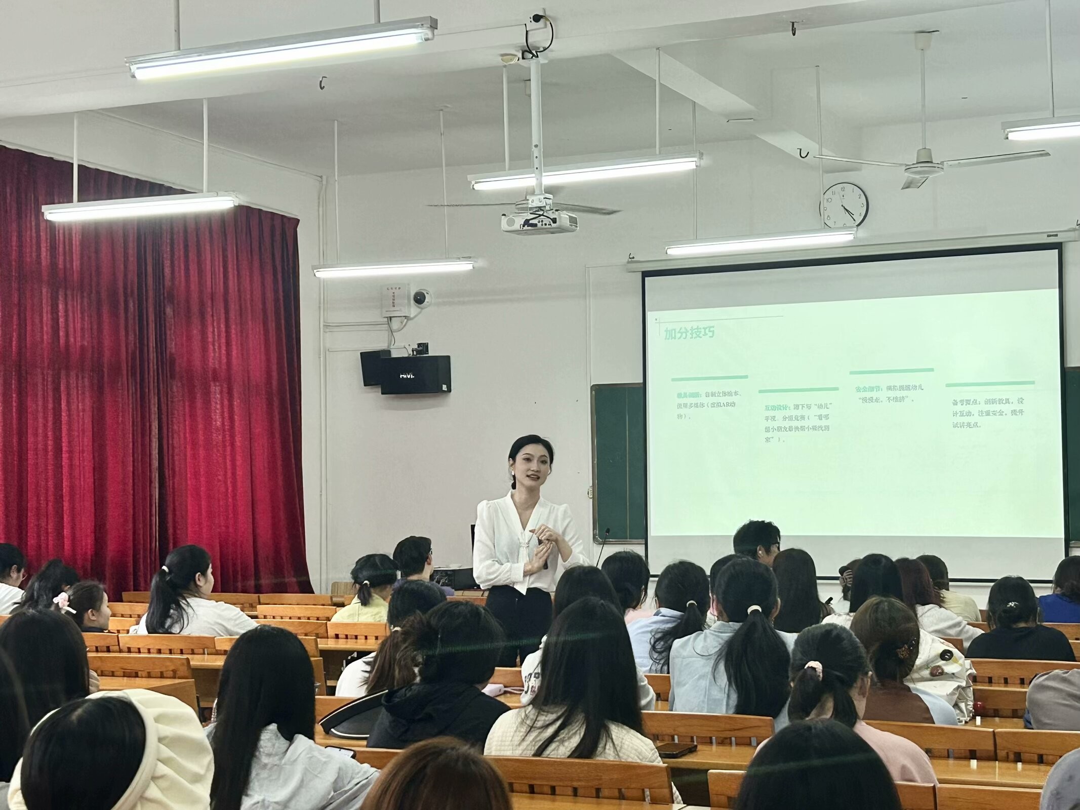 实战锦囊:教师资格考试备考全攻陈美霖老师结合考试科目特点,系统梳理笔试高频考点,围绕笔试策略、试讲准备及结构化面试技巧展开系统讲解提醒学生注重“理论+实践”的双重积累。学前教育专业2022级学生张佳巾以自身备考经历为例,分享时间管理、错题整理与心理调适的实用经验,现场学生反响热烈。