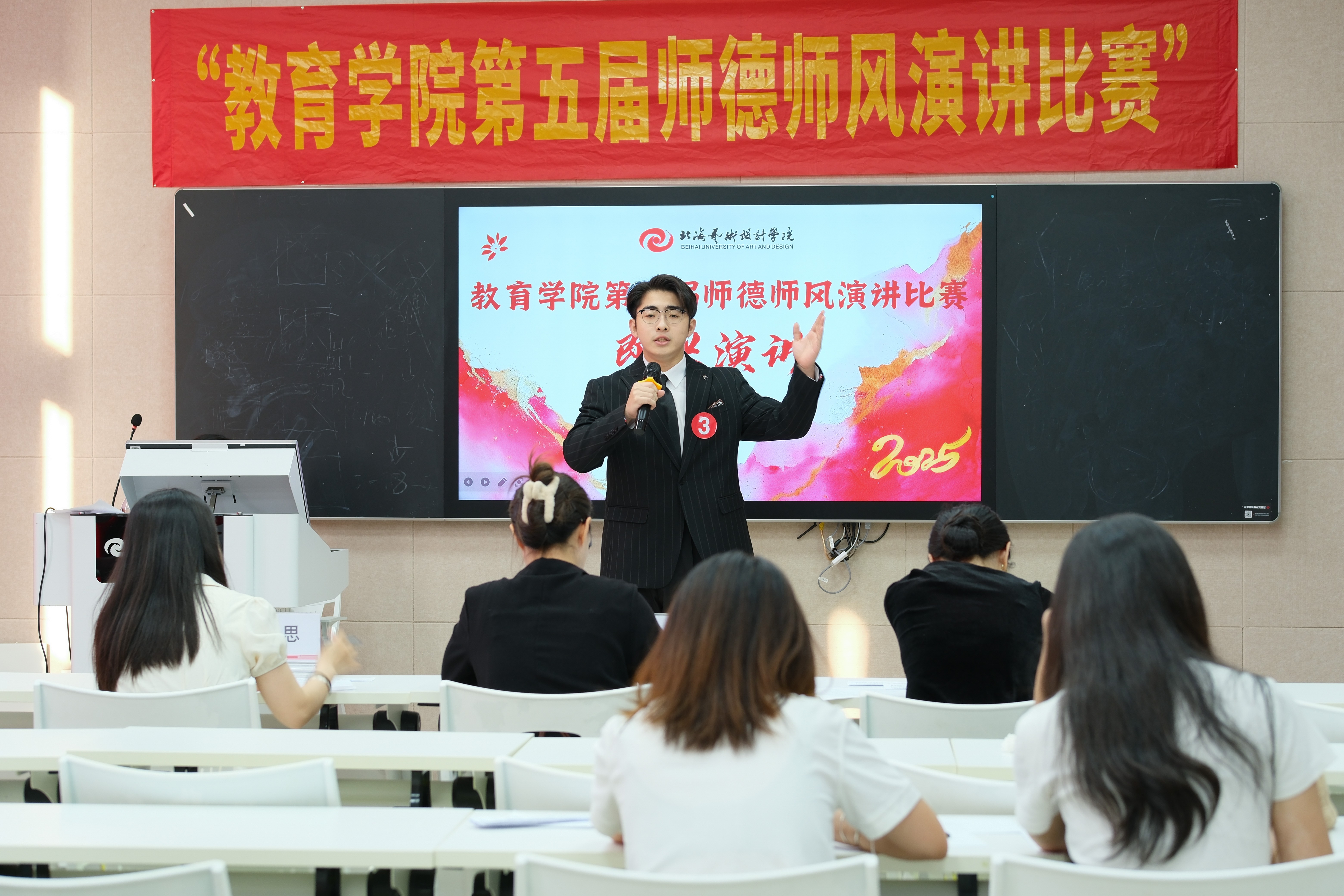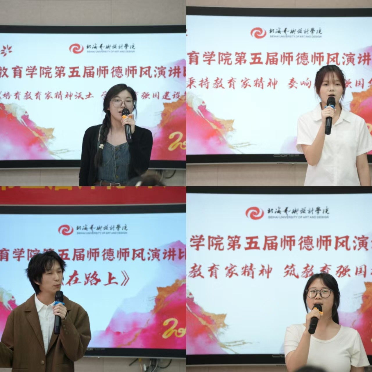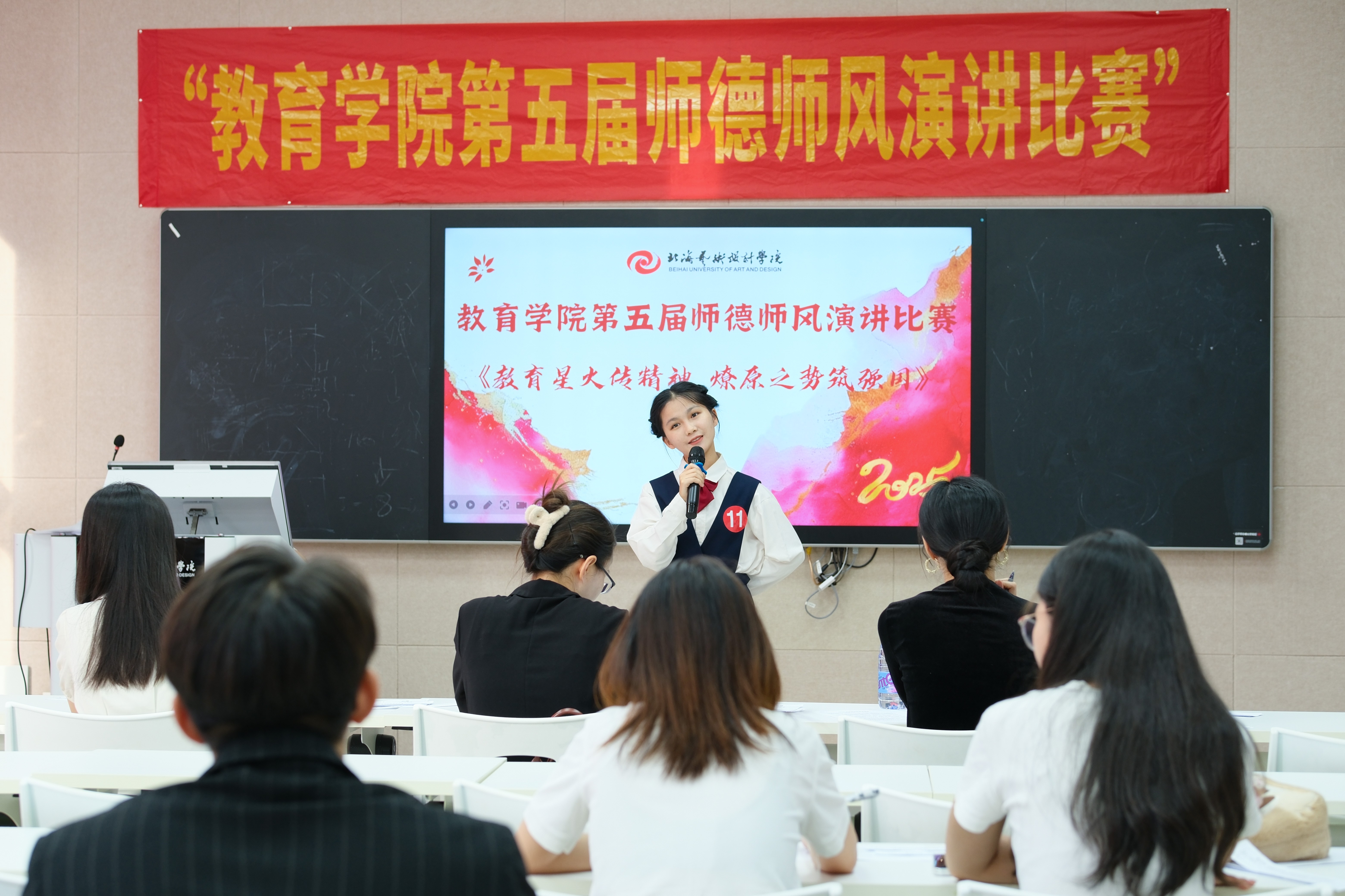 为大力弘扬教育家精神,积极营造尊师重教的良好氛围,引领学生勇担国家责任与弘道使命,自觉锤炼道德品质、塑造理想人格,树立以教育为终身服务的坚定志向,不断提升育人智慧,为教育强国建设贡献青春力量,教育学院于2025 年4月14日—17日,在图书馆五楼智慧教室隆重举办了第五届师德师风演讲比赛。