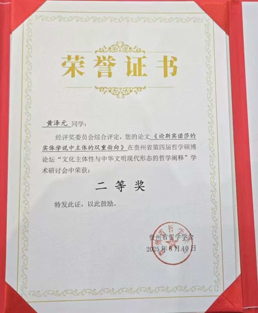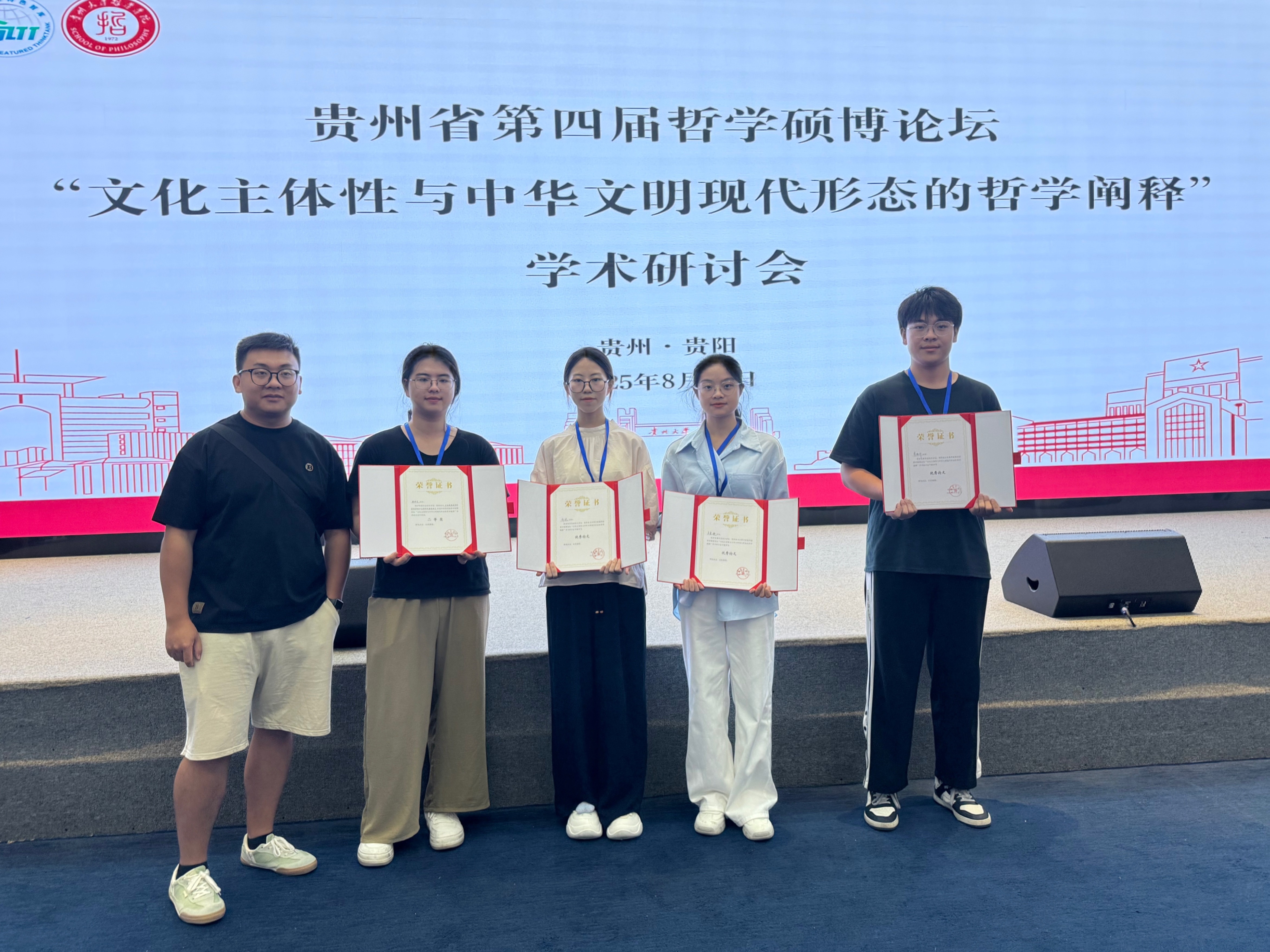 近日,由贵州省哲学学会、贵州大学研究生院、贵州大学人文社科处联合主办,贵州大学哲学学院、中国共产党人“心学”与推进党的建设新的伟大工程高端智库、贵州大学出版社联合承办的“贵州省第四届哲学硕博论坛——‘文化主体性与中华文明现代形态的哲学阐释’学术研讨会”在贵州大学召开。我校哲学学院学生郝悦、常桂邦、黄泽元、罗莹滟参加了此次论坛。参会论文荣获二等奖1项,优秀论文3篇,充分展现了学子学术潜力和学校在人才培养上的育人成果。