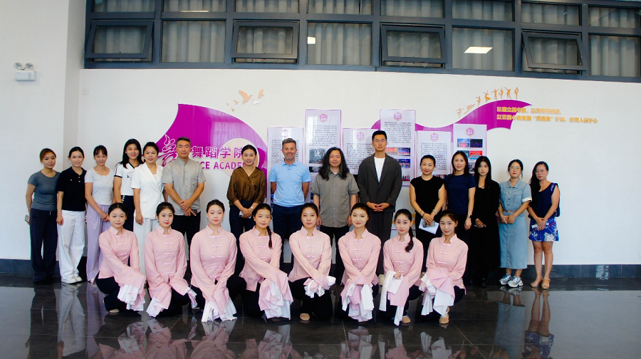 英国切斯特大学David McGravie教授、武虹辰先生和学校常务副校长胡胜教授与舞蹈学院师生合影