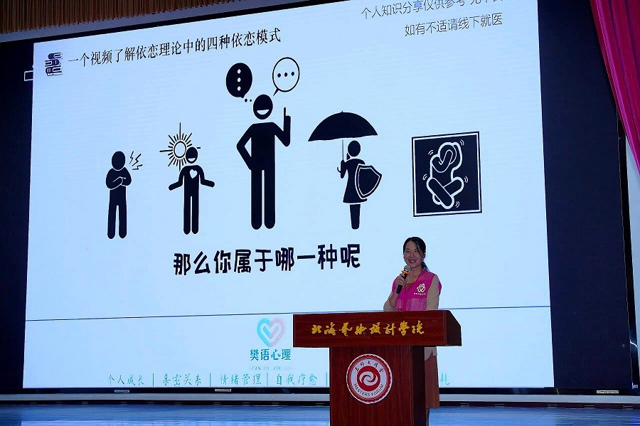 讲座开始由国家三级心理咨询师、中级沙盘游戏咨询师,广西家庭教育研究会理事、北海市家庭教育讲师团成员莫长华老师授课围绕“你的价值不取决于别人对你的评价”等核心观点展开暖心分享,引导同学们建立独立自信的自我认知,深刻剖析了青春情感中易出现的自我迷失问题。强调在亲密关系中保持自我本色、坚守内心边界的重要性,鼓励大家拒绝盲目迎合,以从容姿态面对情感中的起伏与挑战。