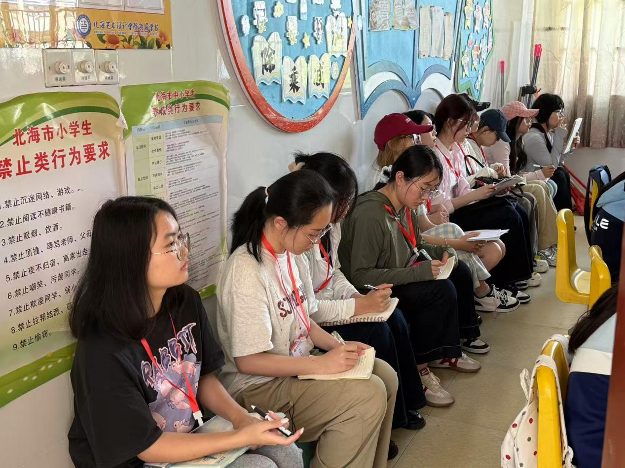 助力学生夯实教学基本功、树立正确的教育理念,2026年3月30日至4月3日,北海艺术设计学院文学院2023级汉语言文学专业学生前往北海市银海区平阳学校,开展为期一周的教育见习活动。此次活动内容丰富、形式务实,在平阳学校各位指导老师的悉心带领与专业指导下,同学们有序开展随堂听课、组织小学生趣味活动、撰写教学设计教案、参加小学语文校内试讲等一系列实践任务,全方位、多角度感受中小学教育教学的日常工作。
