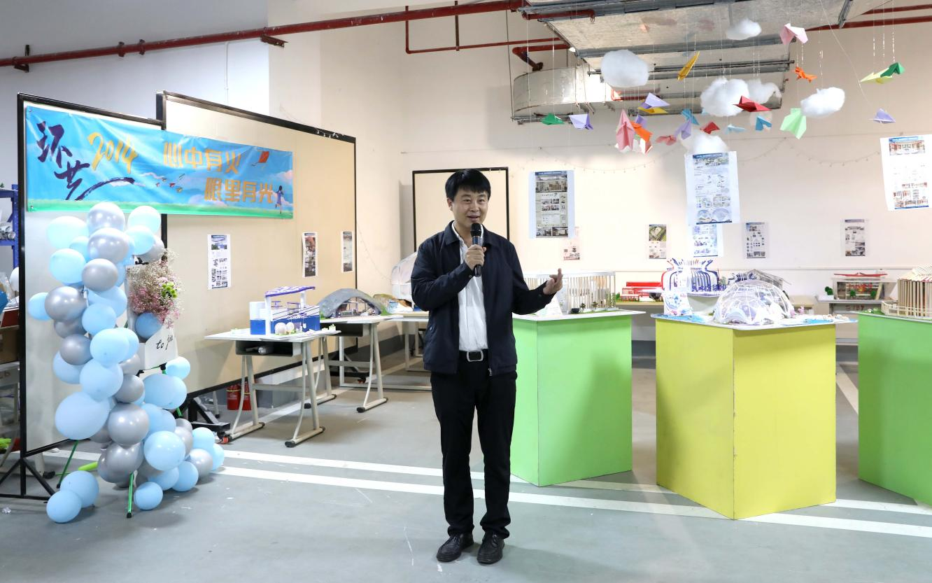 展会伊始,建筑与环境艺术学院副教授石少平对同学们这十二周以来的辛勤付出以及各位领导的参加表示由衷的感谢,并认为同学们在设计制作中的互相配合、互相帮助,充分体现了团结求实的精神,本次活动旨在为社会输送高素质专业人才,提高同学们的职业素养和职业核心能力。
