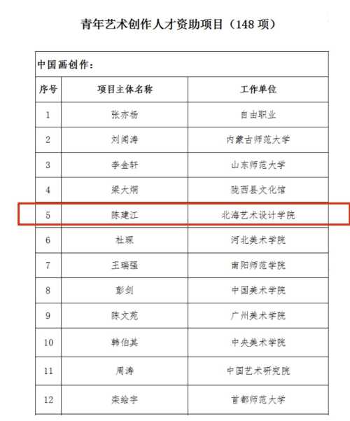 国家艺术基金管理中心3月3日发布《国家艺术基金(一般项目)2023年度资助项目名单公示》,我校美术学院教师陈建江,获青年艺术创作人才项目(中国画创作)立项,也是我校唯一在获得此类立项的项目。