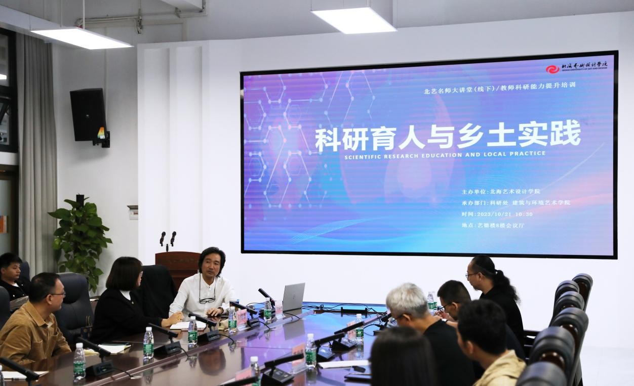 北海艺术设计学院建筑与环境艺术学院于2023年10月21日上午成功举办了一场以“科研育人,乡土实践”为主题的精彩讲座,主题讲座对焦当前高校人才教育发展建设热门话题和高校教师科研创作经验等展开。此次讲座由广西艺术学院科研创作处处长、环境设计学术带头人陶雄军教授主讲,北海艺术设计学院科研处处长刘晓娜进行主持,参会人员包括北海艺术设计学院建筑与环境艺术学院副院长张春东、蔡世伟、王文刚以及各部门负责人和一线教师。