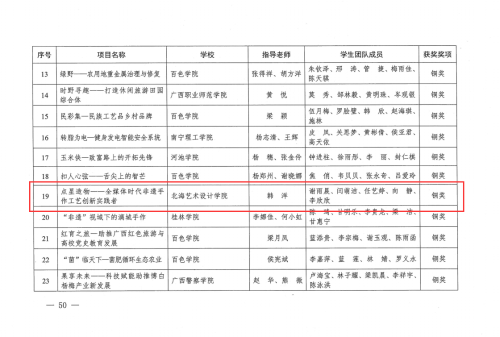 其中北海艺术设计学院美术学院教师韩洋指导的项目“点星造物——全媒体时代非遗手作工艺创新实践者”荣获本科组铜奖,由韩洋、康宗祁老师指导的项目“侗上‘筑’梦——助力非遗技艺传承实践教育”荣获本科组铜奖。