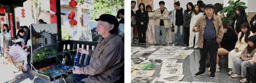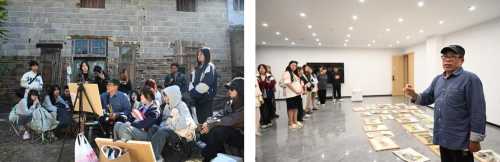 写生是一个循序渐进的过程,同学们白天在老师的带领下,尽情享受户外写生的乐趣,深入探索富川的自然风光与人文景观。夜晚的习作讲评则是检验和反哺教学不可或缺的必要环节,美术学院的教师们认真负责地对每一位同学的画作进行讲评、逐一细化并给予示范指导,确保每位学生都能从中受益。