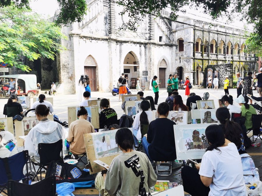 接下来的三天,在教师的带领下同学们前往涠洲岛革命烈士纪念碑、南湾码头、涠洲岛火山国家地质公园盛塘村开展教学实践活动,大家运用所学美术与设计专业方面的知识,以画笔记录下涠洲岛的自然景观与人文风貌,在实地考察中感受岛上的民俗、历史与发展。在白天的写生过程中,教师们通过现场讲授、作范画、逐个辅导等方式取景、构图、光线、色调等方面为同学们进行了悉心的指导。晚上,教师们组织各班级开展集中讲评活动,指出画面中的优点和不足,分析问题,总结得失。