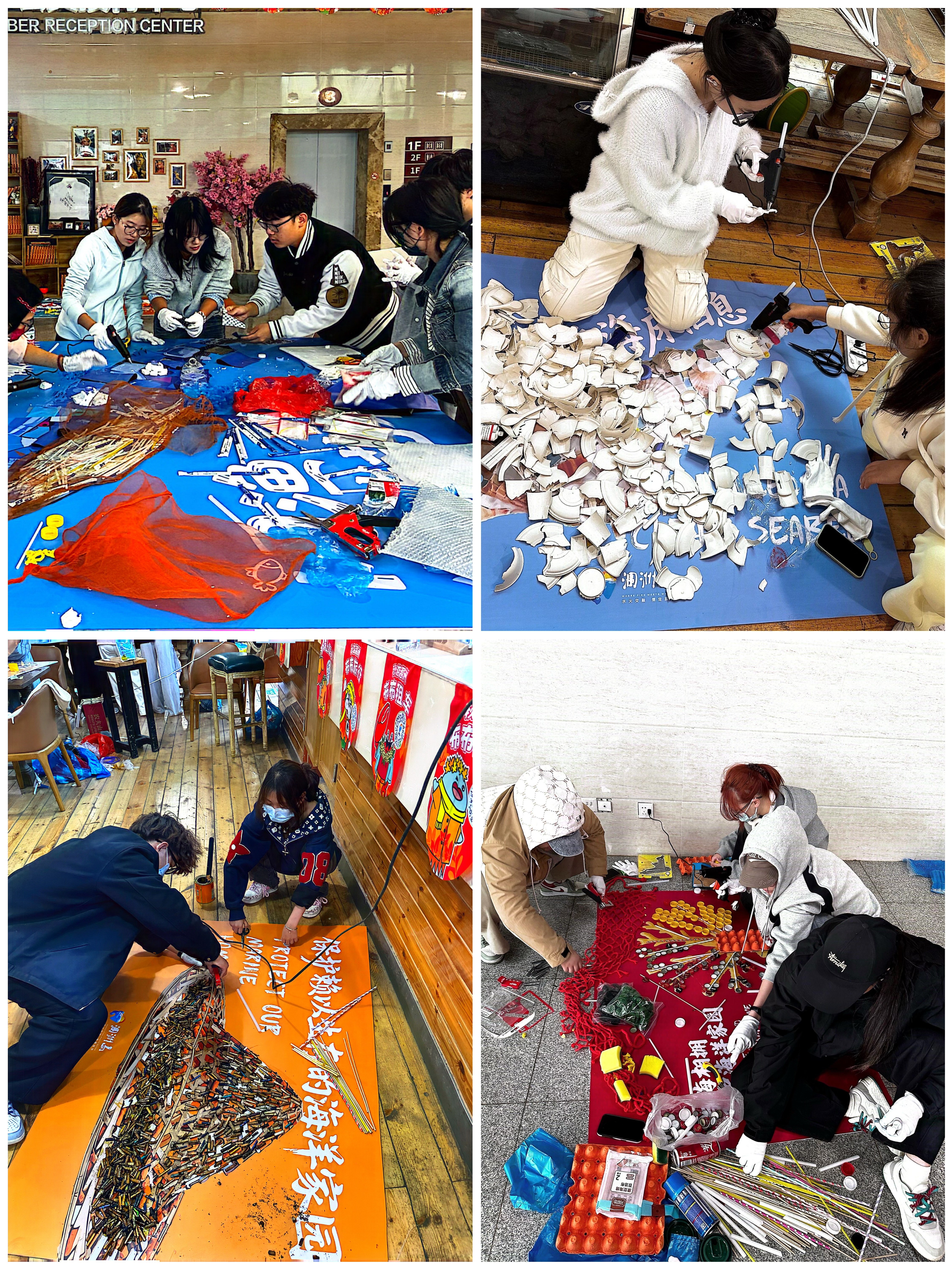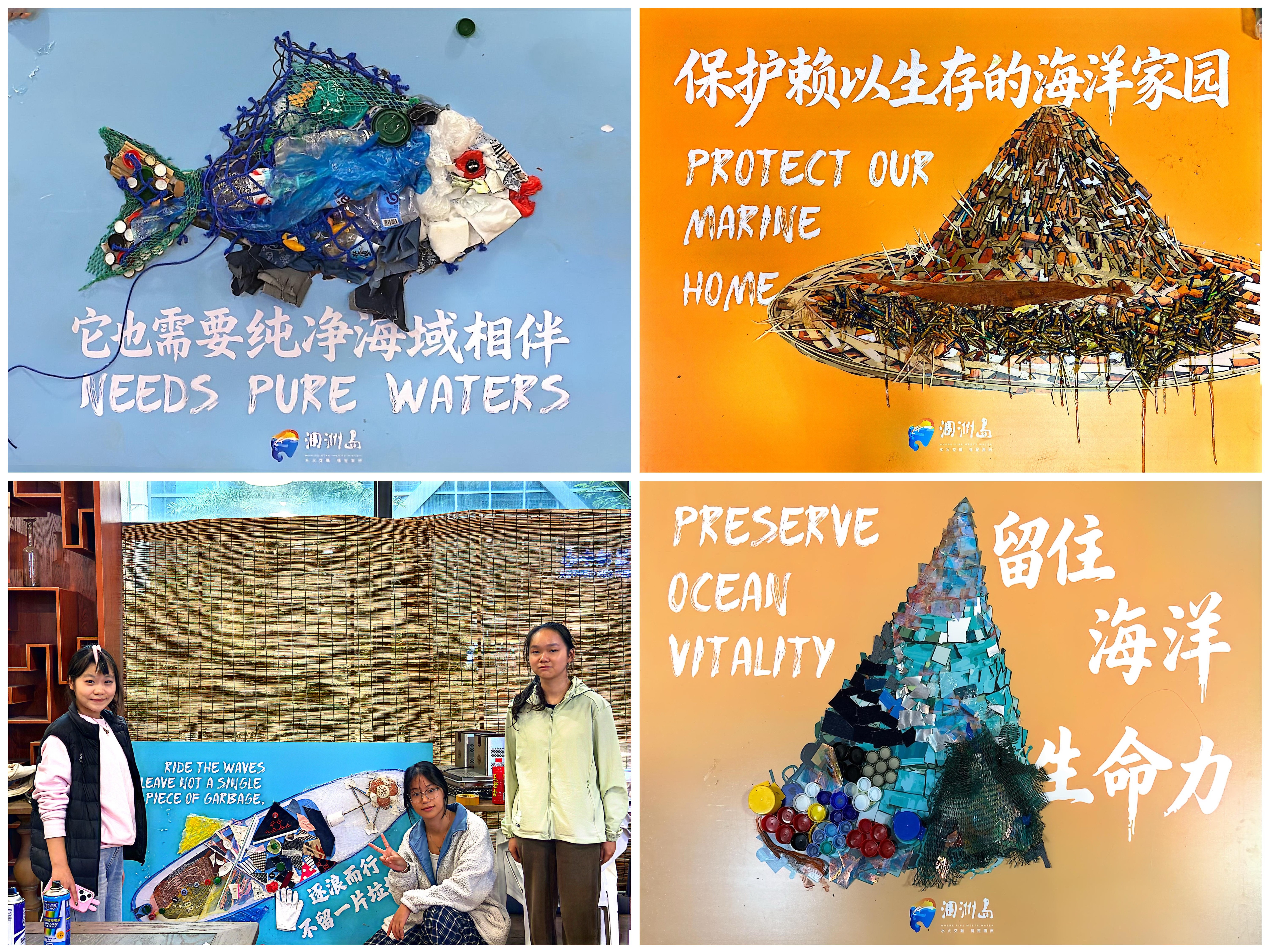 活动由书法学院常务副院长苏乃从、党支部书记喻广林及副院长韦志忍共同带队。七十名学生分两批,分别11月19日、20日参与了此次志愿服务学生们充分发挥艺术创作特长,以吸管、碎布、渔网等回收材料为创作媒介,在预设的海洋主题底图上进行艺术拼贴。日常废弃物经创意重构,化为生动立体的海洋意象,直观呈现“资源再生”的环保内涵。学生在高效完成艺术创作的同时,也展现出良好的团队协作能力与执行力彰显了新时代青年服务社会、勇于担当的精神风貌