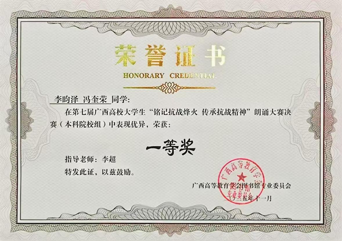 本次大赛以“铭记抗战烽火,传承抗战精神”为主题,作为广西高校语言艺术领域极具影响力的赛事,赛事自启动以来便得到全区各高校积极响应,历经校内初评、自治区复赛的层层严苛筛选,最终仅有24组选手从数百部作品中脱颖而出晋级决赛,高水平角逐的激烈程度不言而喻。传媒艺术学院高度重视此次赛事,选送作品《在欢呼的人群中》精准锚定“胜利喜悦与先烈缅怀”的情感基调,从语言表达的节奏轻重到舞台呈现的姿态眼神,以细节展现了对作品精神的深刻理解。决赛现场,李昀泽、冯奎荣同学凭借扎实的语言功底、默契的舞台配合,将抗战胜利后人民群众的自豪与崇敬诠释得淋漓尽致,稳健大气的台风赢得评委团高度认可和现场观众阵阵掌声。