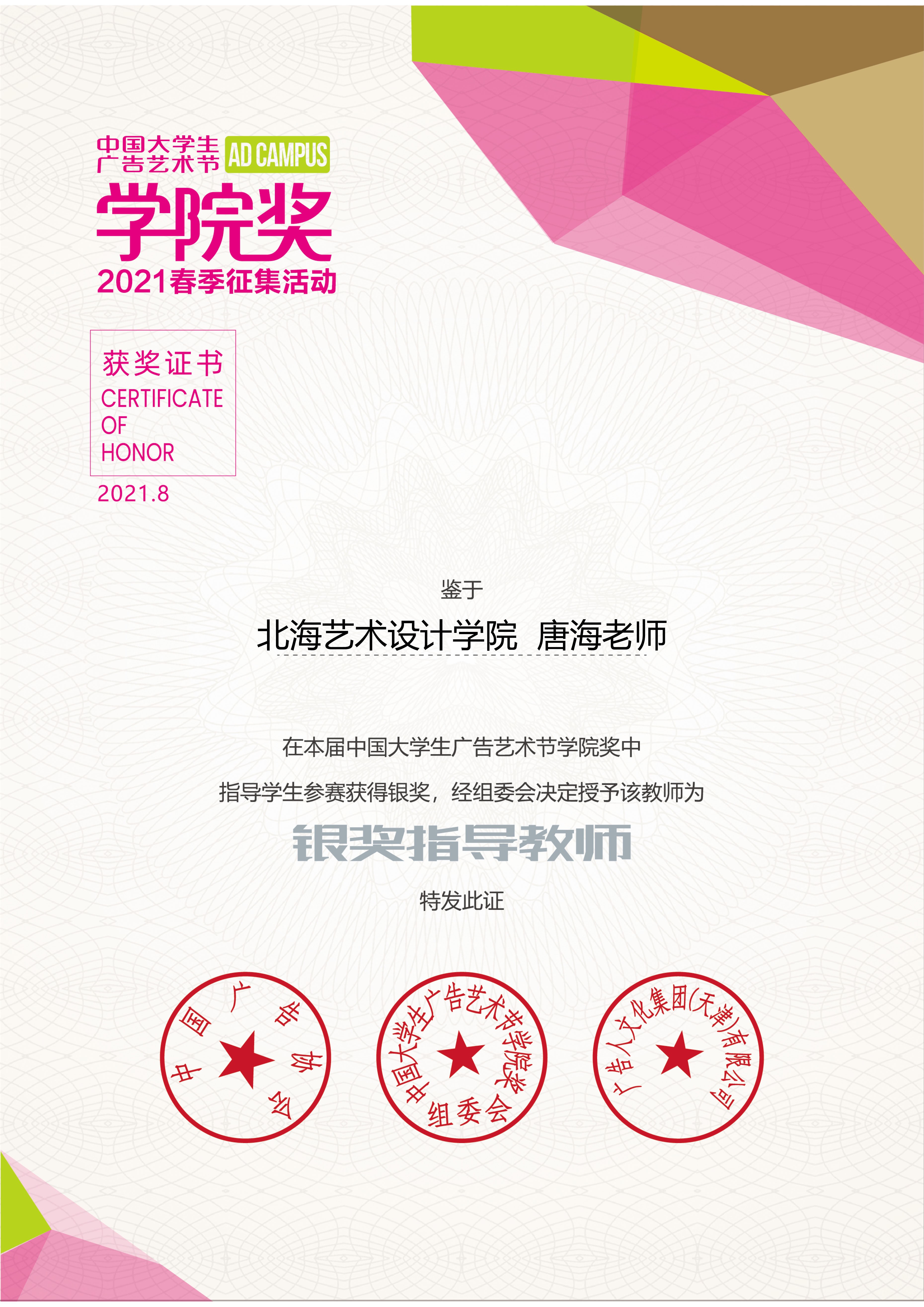 8月22日,中国大学生广告艺术节学院奖春季赛举行颁奖典礼,我校美术学院唐海老师指导的绘画1805班袁沁佳同学作品获得《冰泉》漫画类银奖。此次《冰泉》命题分平面广告类、漫画类、策划文案类、设计类、影像类五项,参赛作品近三万件,每个类别评选出金奖一项,银奖一项。此外,唐海老师指导学生作品还获得优秀奖七项、入围奖六项。