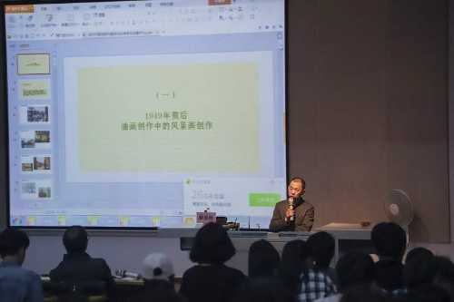 蔡国胜教授向同学们分享了许多名人画家的风景油画作品。他按照油画发展历程为大家讲述了从1949年新中国成立到现代风景油画的七个历史阶段。蔡国胜教授的讲述非常生动具体,他从新中国前后油画类型的其中之一风景画创作开始,讲述当时油画的创作大部分都受到了西方工业革命的影响,许多风景油画都表现出了印象派的艺术手法。接着讲到后来的赴俄罗斯留学时期,马科夫摩西培训班的成立,“罗训班”后第三代油画家的创作,再到国美博巴油画班成立,新世纪前后央美高研班油画的多样性的时期,以及油画语言尝试推动市场需求激发油画风景的“写生热”。这一系列发展历程都足以说明我国风景油画绘画水平不断地发展进步。