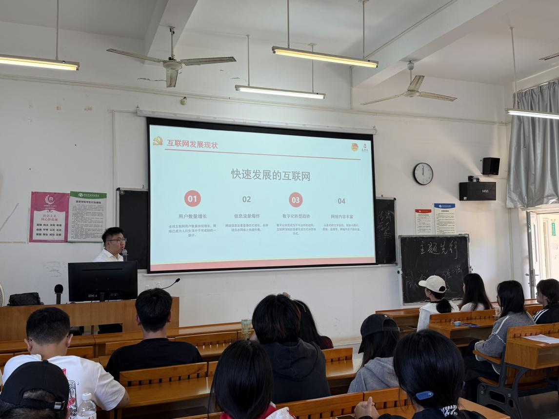 活动伊始,马有泽书记以“数字时代青年的网络责任与担当”为主题展开分享。他结合中国互联网络信息中心发布的最新统计报告,用翔实的数据图表让同学们对当下互联网发展现状有了更直观的认知。同时,他结合“校园生活话题网络传播”“传统文化线上推广”等贴近学生的实例,深入解读网络舆论传播规律,让同学们对自身所处的网络环境及角色定位有了更深刻、更立体的认知。