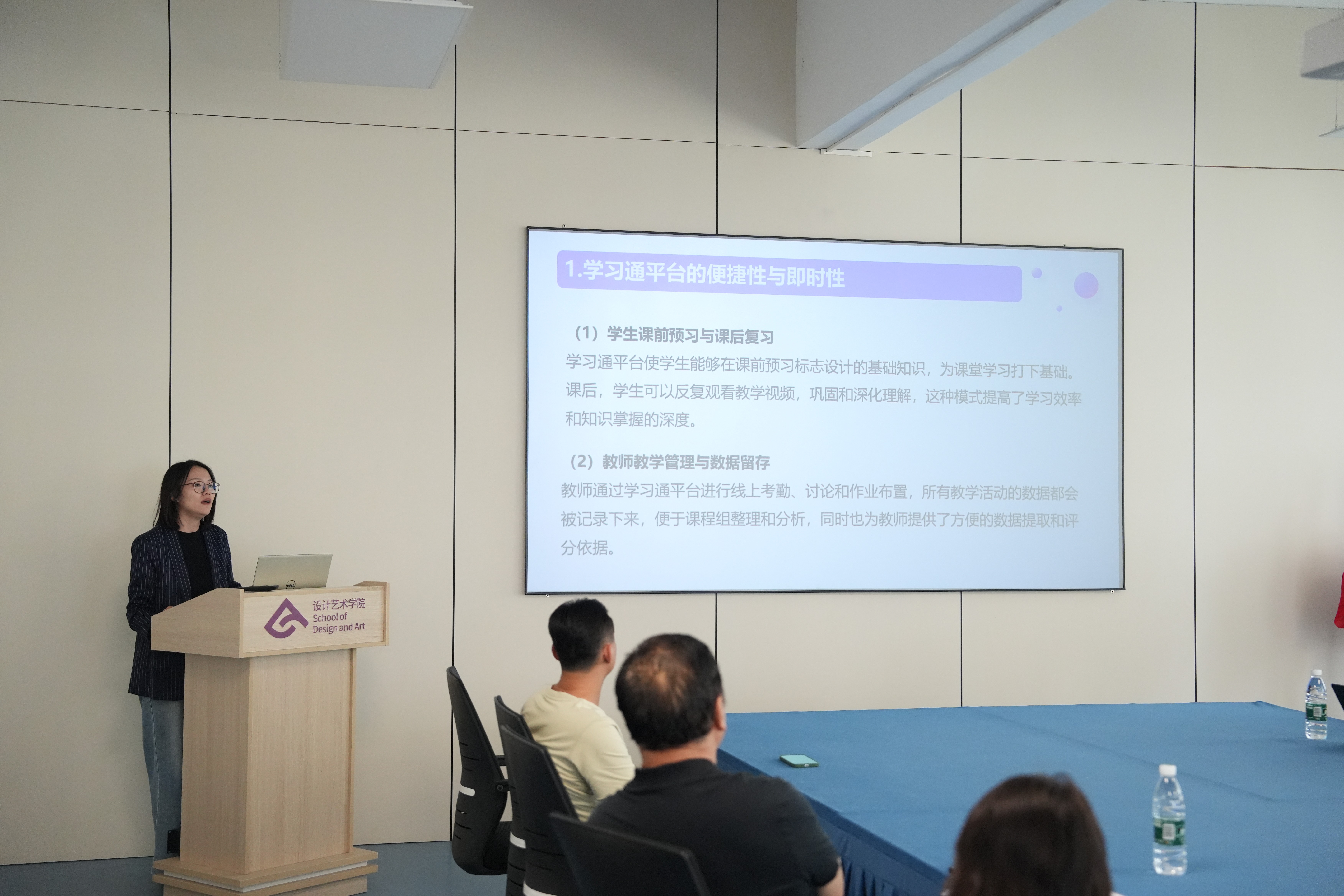 紧接着,2024-2025(一)学年标志设计课程的主课教师刘馨详细介绍了本学期标志设计的课程教学改革设计,内容包括线上线下融合的教学模式、结合阿里云ARTLAB平台(AIGC人工智能)的教学创新、乡村振兴与竞赛驱动教学、以及多维评价方式的实施,展现了课程改革的前瞻性和实践性。