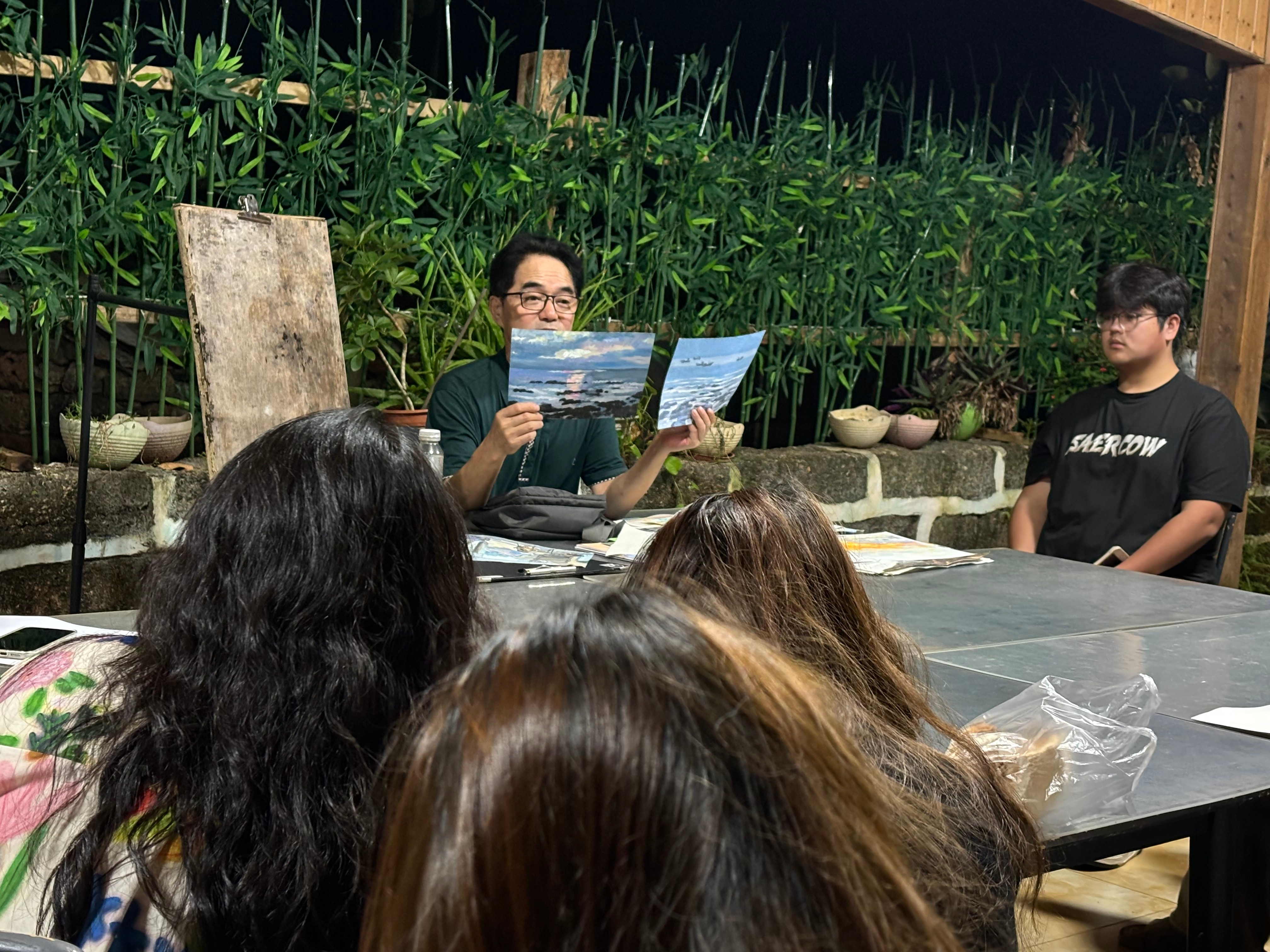 在涠洲岛期间,师生们分别前往南湾码头、天主教堂、鳄鱼山景区等地标性景点。通过“现场写生”与“环境考察”相结合的方式,捕捉自然生态与人文景观之间的共生之美,赋予作品生命力。在此过程中,位教授在现场传授专业技艺,创作高质量范画。在课后,老师围绕作品的构图布局、色彩运用、情感表达等多个维度对学生们的作品进行点评,指出亮点不足同时解决创作过程所遇实际问题,以期同学们创作更多优秀艺术作品