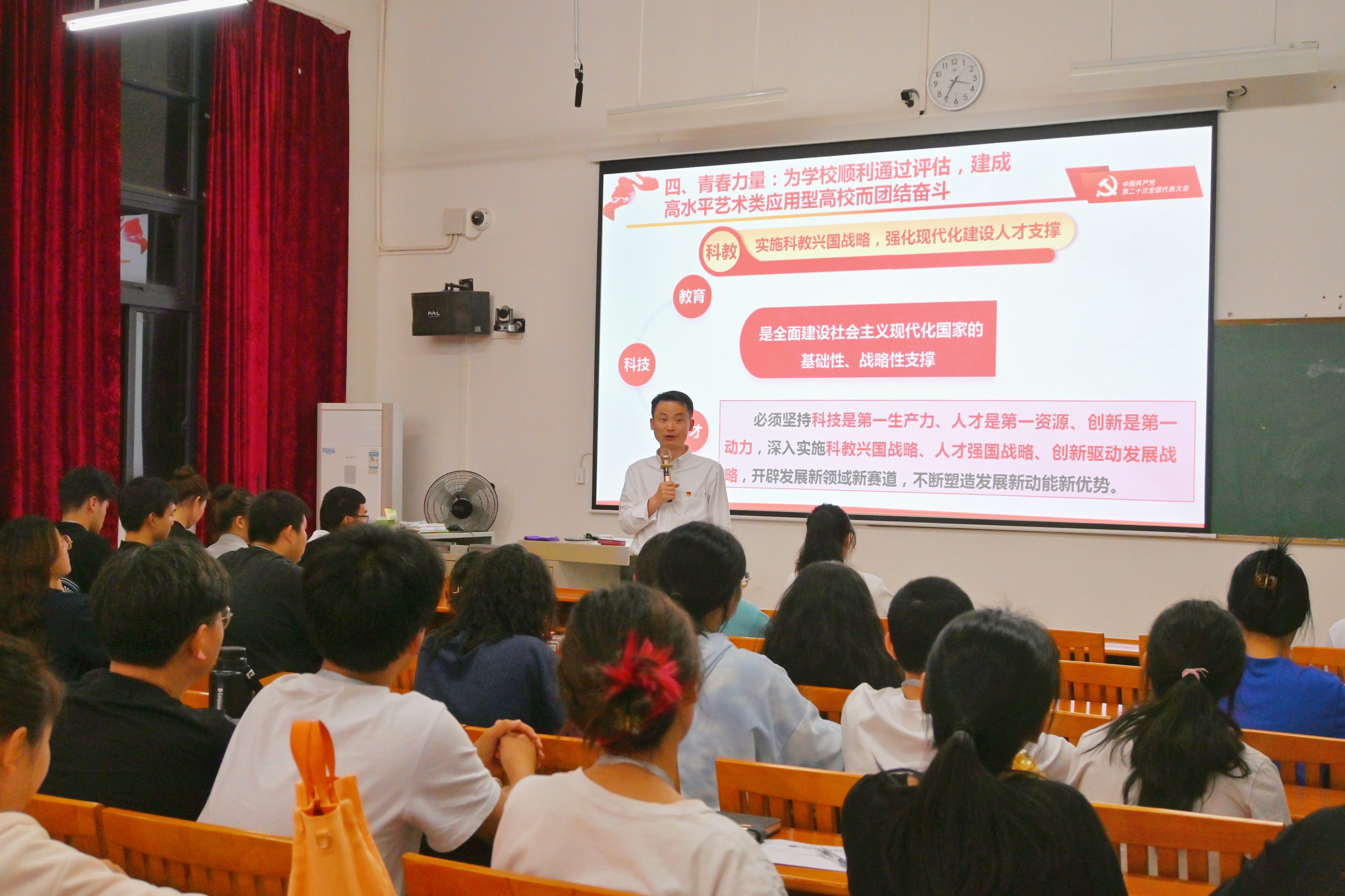宣讲会上,刘承初委员指出,学习党的二十大精神,要注意将学习成果转化为指导工作实践的驱动力和执行力,面对当前学校本科教学合格评估这一光荣而又艰巨的任务,同学们要充分认识教学合格评估工作的重要性,端正心态,实干担当,积极配合学校做好评估的各项工作。