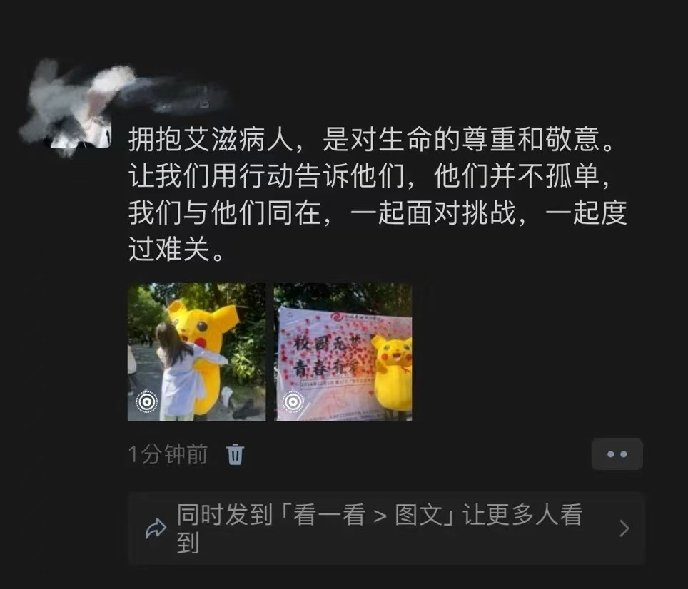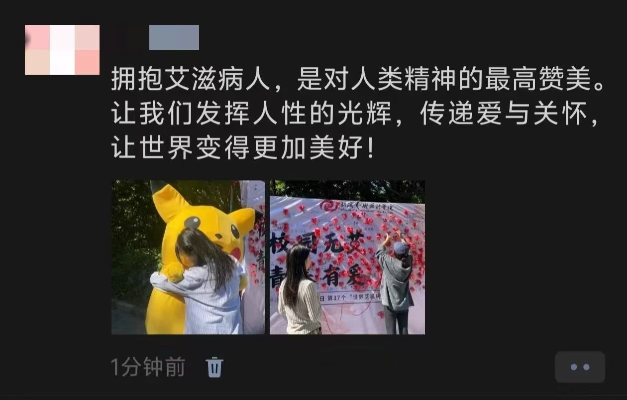 在伦理楼前,通过“艾”的抱抱、“艾”变成“爱”、“艾”的预防,“爱”的传播、“艾”的圈套等多个互动小游戏,号召更多同学加入知“爱”防“艾”的行动中来,表达了爱的传递与流动,呼吁在这个充满“爱”的校园里,提升预防“艾”的能力。在游戏结束后,部分同学还积极分享了自己对于艾滋病的认识与看法,在校园内营造了一种积极向上、充满爱的氛围,呼吁同学们用实际行动传递“爱”。