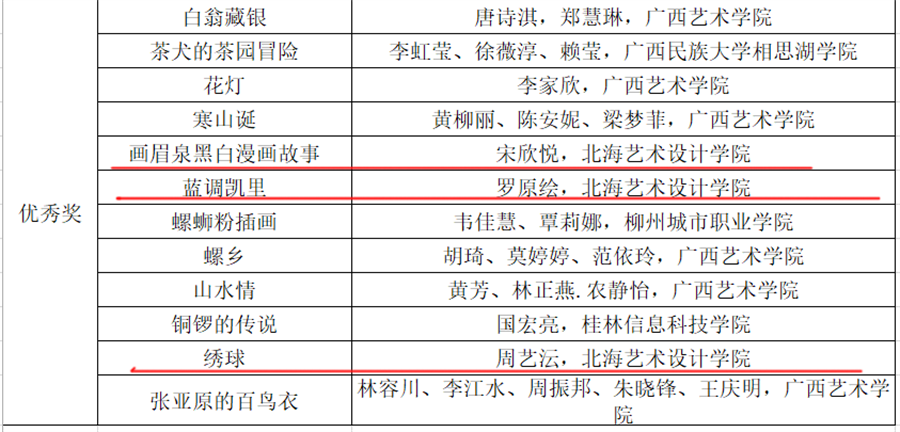 近日,由广西壮族自治区文化和旅游厅、自治区教育厅、自治区科学技术厅、自治区农业农村厅、自治区商务厅、自治区国资委主办,广西广文创意数字科技有限公司承办的“漫绘广西,秀展八桂” 2022广西金桂国漫大赛公示了获奖名单。我校动画与传媒学院共获奖11项,其中场景类二等奖3项、三等奖1项、优秀奖1项;动漫角色设计类二等奖1项、三等奖1项;广西特色文化类三等奖1项、优秀奖3项;孙永辉、 虞德强、李宗毅、吴锡红等老师荣获优秀指导教师奖;动画与传媒学院获优秀组织奖。