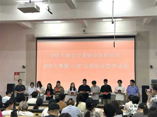 为强化大学生交通法治安全意识、文明意识,增强大学生道路交通安全宣传教育工作的针对性、实效性,着力提升大学生群体的道路交通安全风险防范意识、守法意识,推进交通安全文化建设工作,近日,我校联合北海市公安局交通警察支队法制宣传大队在西校区公德楼107教室举行全区大学生交通安全宣传作品创作大赛颁奖典礼暨“七进”交通安全宣传活动。学生工作处副处长马啸,北海市公安局交通警察支队法制宣传大队副大队长金子,各二级学院师生代表参加活动。