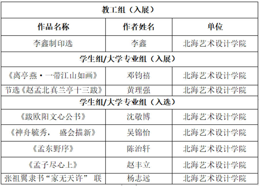 近日,“园丁杯”广西教育系统第八届书法篆刻作品展结果公布,我校书法学院教师李鑫及七名学生入围了“园丁杯”广西教育系统第八届书法篆刻作品展,其中李鑫老师及两名学生荣获入展级别,五名学生荣获入选级别。