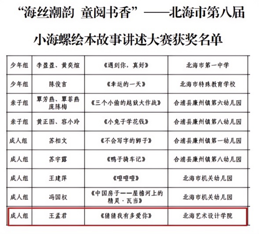 近日,由中共北海市委宣传部、北海市旅游文体局、北海市教育局、北海市妇女联合会及关心下一代工作委员会联合主办,北海市少年儿童图书馆承办的北海市第八届小海螺绘本故事讲述大赛顺利举办。我校教育学院学前教育专业学生王孟君参赛并表现突出,荣获成人组优秀奖。