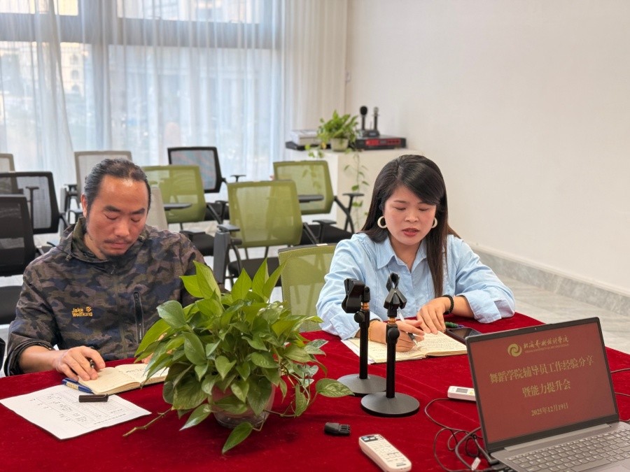 会上,2023级辅导员谷乐、信辛,2024级辅导员韦邕青师分别作经验分享。信辛老师聚焦舞蹈专业班级精细化管理,通过明确班委分工、规范材料收发流程、建立考勤特殊报备机制,实现制度执行与人文关怀并重;韦邕青老师围绕“严管厚爱”,以严格考勤统计、“先稳情绪再理事情”的突发处理原则及常态化风险预警教育,为学生成长护航;谷乐老师针对舞蹈生高强度训练易伤病、寝室相处等特点,协调调整训练计划,采用“多方求证”方式化解寝室矛盾,通过常态化走访训练室与寝室,精准关注学生学业、伤病恢复及经济困难等需求,将育人关怀落到细节。