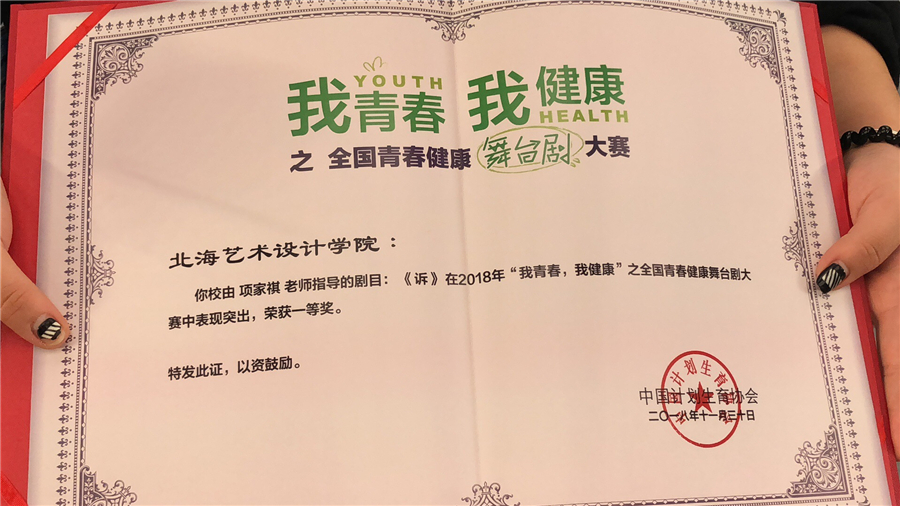11月30日下午3点,由中国计划生育协会主办的“我青春,我健康”之全国青春健康舞台剧大赛在北京上演,我校话剧社陈曦、李坤、李银秋等7名学生在项家祺老师的带领下,代表学校到北京参加了此次比赛。经过激烈的角逐,我校的参赛作品《诉》从近300部的参赛作品里脱颖而出,荣获全国一等奖,同时,通过现场投票,《诉》获得最佳剧本奖和“卓别林”的扮演者佘胜男获得最佳人气男演员。