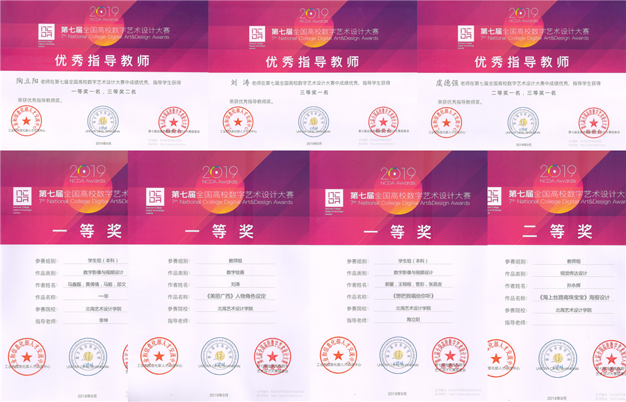 在此次活动中北海艺术设计学院动画学院教师组获一等奖1项,二等奖1项,其中陶立阳、刘涛、虞德强、韩玮、黄光宗、庄凯丽,李坤8名教师获优秀指导教师;学生获一等奖3项,二等奖6项,三等奖8项;动画学院获卓越贡献奖。
