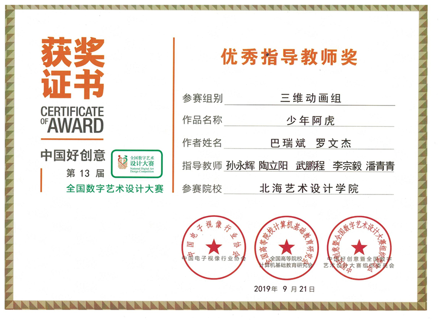 三维动画组《少年阿虎》优秀指导教师奖