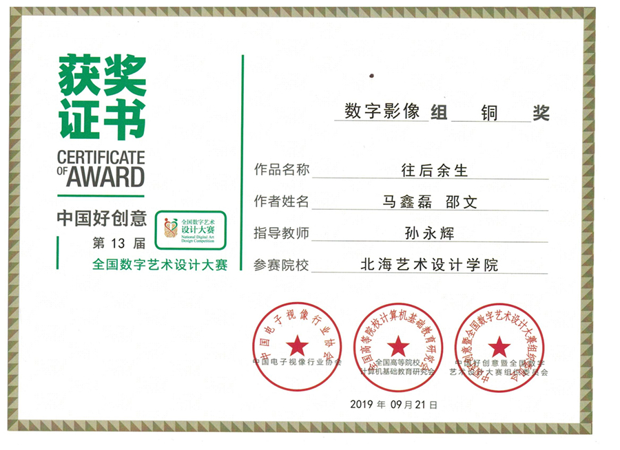 第十三届中国好创意全国数字艺术设计大赛颁奖盛典于2019年10月24日至10月28日在杭州浙江工业大学成功举行。动画学院在众多参赛作品中脱颖而出,共获得了1金1铜的好成绩。