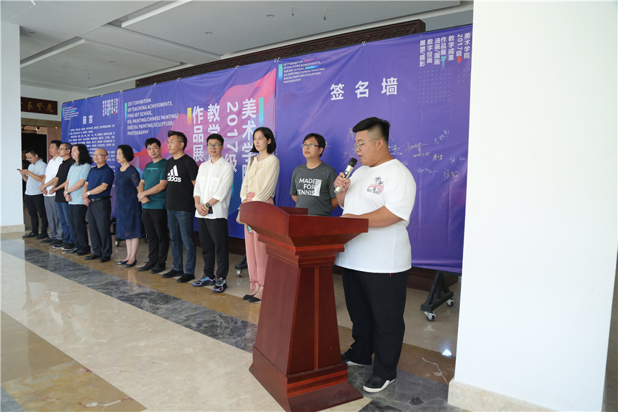 7月25日下午4:30,美术学院2017级教学成果展在西校区图书馆一楼展厅开幕。此次展览共展出绘画作品127件、摄影115件、雕塑62件。我校党委书记李高南,副校长张跃、胡胜、彭仁、王斌、邱杰等校领导以及各二级学院相关领导应邀出席开幕仪式。