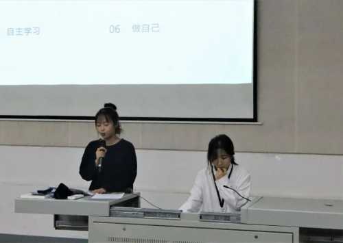 活动第五项:19、20级学长学姐上台进行分享学习经验。分别为:人文教育学院周可柔同学,动画传媒学院马妍同学。